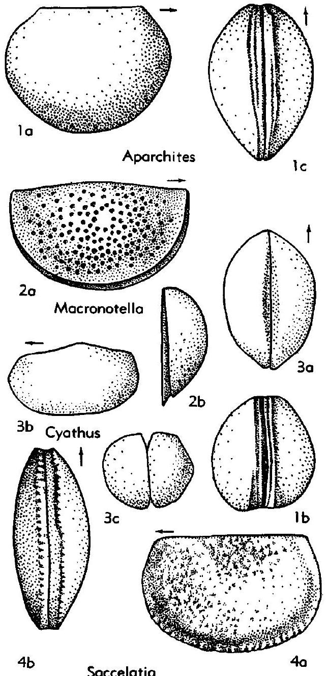 Fig. 107,1. *A. whiteavesi, M.Ord., Can.(Man.), 1a-c, carapace (holotype) R lat, end, vent., X10 (186). -- Fig. 108,2a. ?A. kauDmanensis SWAIN, M.Ord.(Chazy.), USA(Pa.); RV lat., X20 (356). -- Fig. 108,2b-e. ?A. crossotus KESLING, M.Dev., USA(Mich.) ; 2b-e, RV (holotype) lat., lat. showing muscle scar, int., vent., X40 (201). -- Fig. 108,2f-h. A. fimbriatus (ULRICH), M.Ord., USA(Minn.); 2f, ?heteromorph carapace L lat., X22; 2g,h, ?heteromorph carapace L, vent., X22 (J.R. Cornell, n). -- Fig. 109,1. A. fimbriatus (ULRICH), M.Ord. (Edinburg F.), USA (Va.); 1a,b, LV lat., LV int., X10, X9; lc, carapace vent., X13; 1d,e, LV lat., LV lat. (juv. instars), X13; 1f, muscle scar, X22 (J.C. Kraft, n). [In checking proofs, HESSLAND notes that Figures 108 and 109, illustrating species added by the editor, are questionably assignable to Aparchites; moreover, he judges that "A. fimbriatus" actually belongs with oepikellid forms. -Ed.]