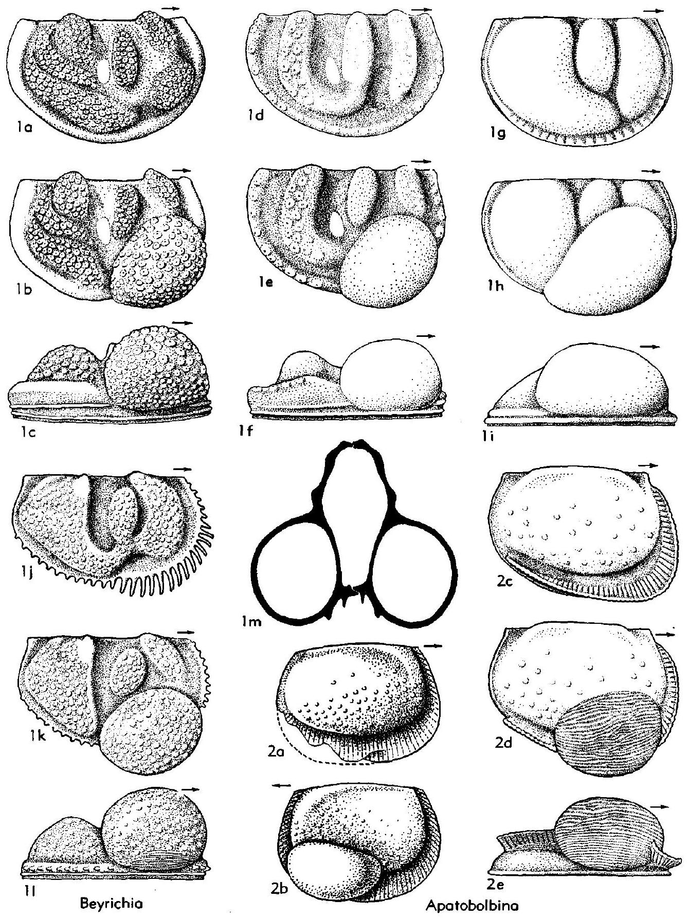 Fig. 48,1a-c. B. tuberculata (Klöden), U. Sil. (Ludlov.), Gotl., 1a, male RV lat., ×14, 1b, c, female RV lat., vent., ×14 (Kesling, 1957). -- Fig. 48,1d-f. B. buchiana Jones, U. Sil. (Ludlov.), Gotl. (type species of Neobeyrichia, 1d, male RV lat., ×16, 1e,f, female RV lat., vent., ×14 (Kesling, 1957). -- Fig. 48,1g-i. B. salteriana Jones, U. Sil. (Ludlov.), Gotl., 1g, male RV lat., ×31, 1h,i, female RV lat., vent., ×26 (Kesling, 1957). -- Fig. 48,1j-l. B. fittsi Roth, L. Dev., USA (Okla.), 1j, male RV lat., ×24; 1k,l, female RV lat., vent., ×24 (Kesling, 1957). -- Fig. 48,1m. B. jonesii Boll, M. Sil. (Wenlock.), Gotl., % carapace transv. sec. showing cruminal pouches, ×24 (Kesling, 1957). -- Fig. 27C, 28. B. moodeyi ULRICH & BASSLER, M.SiJ.(Clinton.), USA (N.Y.); type species of VelibeYl'ichia, 27C, transv. sec. female LV, enlarged (Wainwright, 1959); 28, serial transv. sees. (Wainwright, 1959).