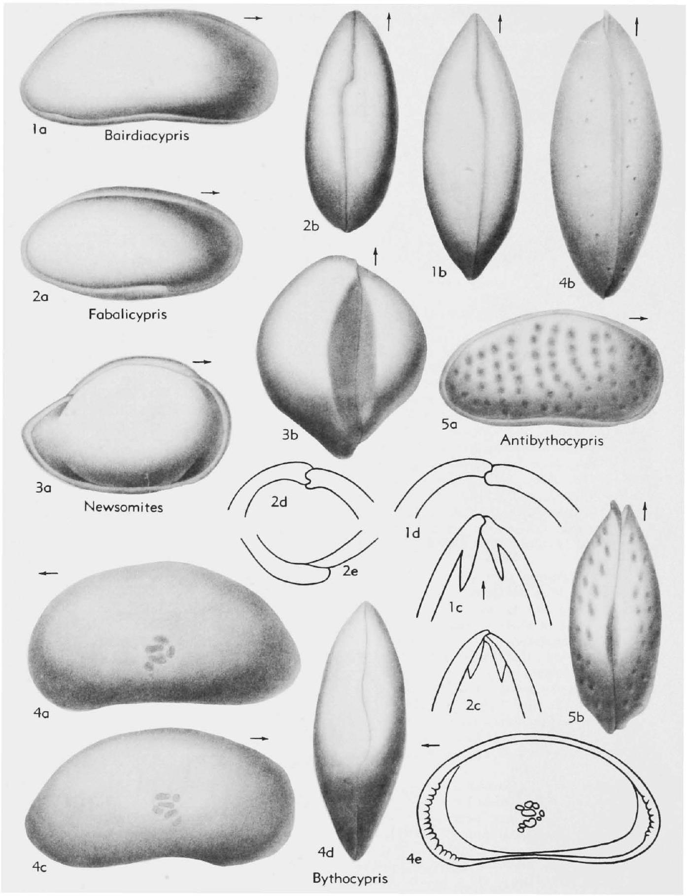 Carapace reniform in lateral view, with straighter venter and more rounded dorsum and extremities, mostly lacking angulation and asymmetry of Bairdia, but with similar overlap and overreach, ridge-and-groove hinge, duplicature, vestibule, and associated structures, including muscle scar (53). [Many modern species are defined partly on the basis of soft parts, whereas numerous Paleozoic species do not exhibit the muscle scar and marginal structure of Recent Bairdia and other Bairdiidae. Altogether, the genus is in an unsatisfactory condition, nearly all Paleozoic species being doubtfully assigned to it.]