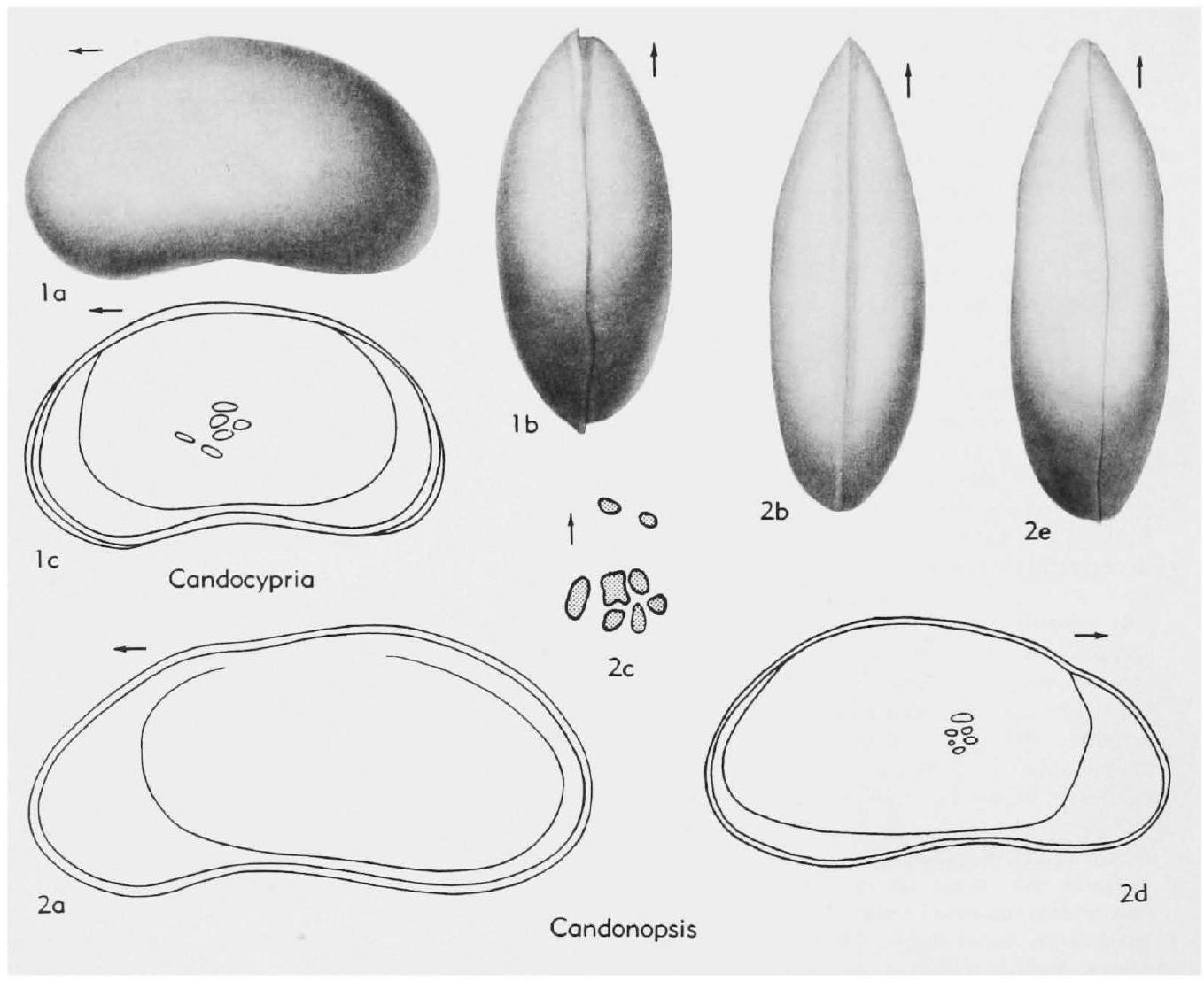 Fig. 171,2. *C. kingsleyi (Brady & Robertson), 2a,b, RV int., carapace dors., X60, X50; 2c, muscle scar, X110, 2d, male LV int., X50, 2e, male carapace dors., X50. ( 2a-c, 40, 2d,e, 257 )