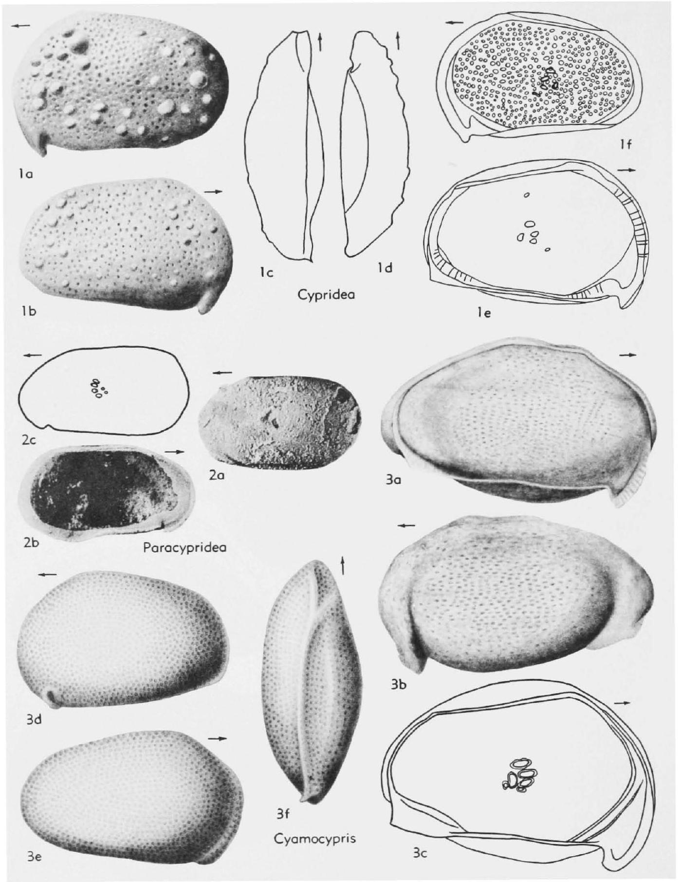 Fig. 177,1a-d. °C. (C.) granulosa (SOWERBY), Jur., Eng.; 1a,b, carapace L, R; 1c,d, LV dors., RV dors.; all X40 (79). -- Fig. In, 1e,j. C. (C.) prop/l71eta SYLVESTER-BRADLEY, Jur., Eng.; 1e,j, LV int., RV int., X50 (79). -- Fig. 178,1. C. (C.) wyomingenslS JONES, L.Cret. (Draney F.), USA(ldaho); 1a, LV lat.; Ib-d, carapace R, dors., vent., all X 35 (200).