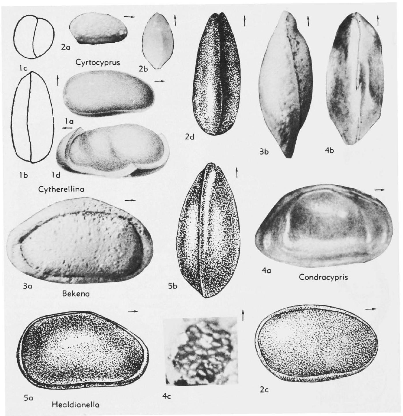 Fig. 285,1. *C. siliqua (Jones), M.Sil., Eng., 1a-c, carapace R, vent., post., 1d, LV int. with clinging shell, lat., all X20 (188).