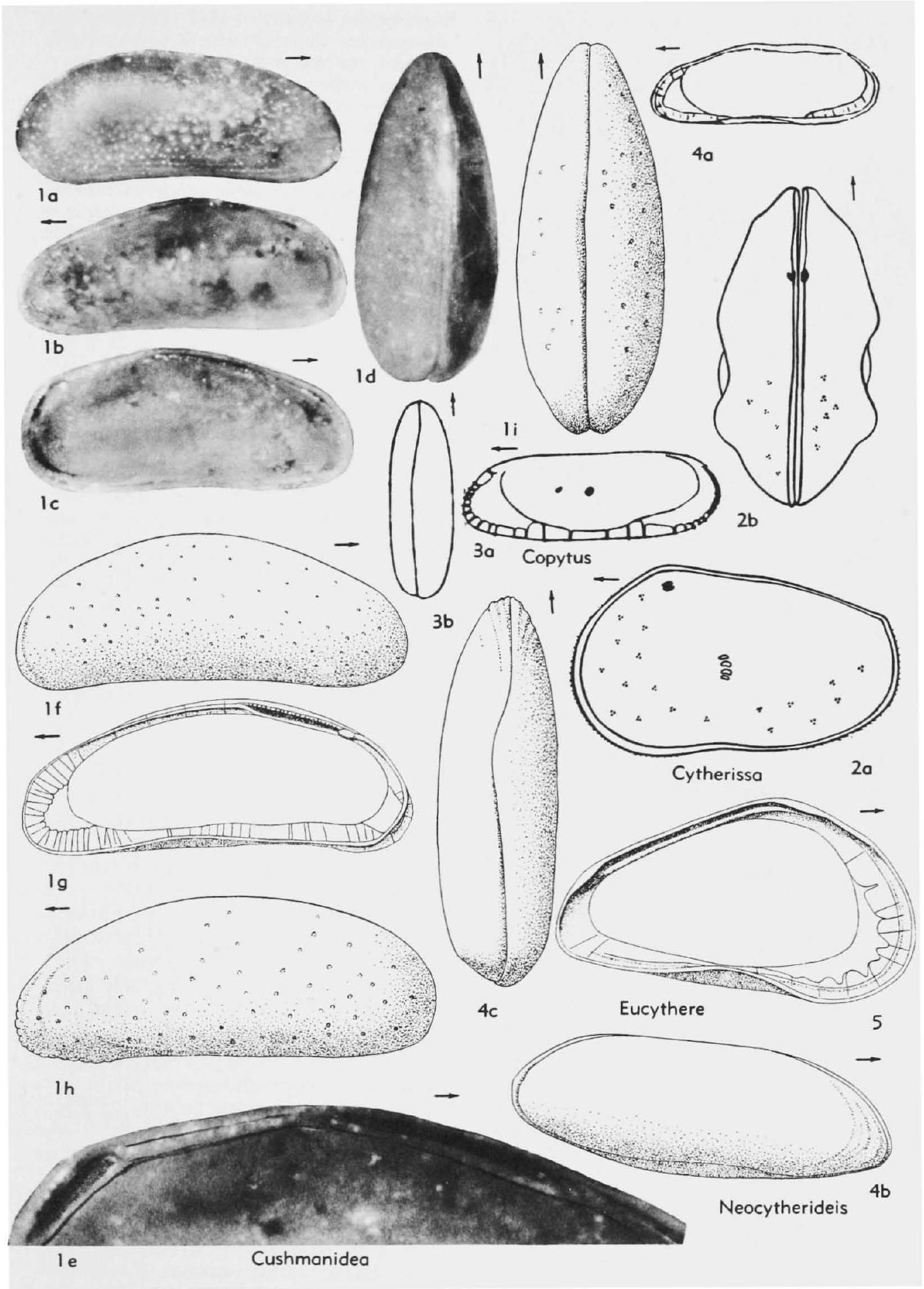 Shape of carapace variable but generally resembling Cytheridea, in some species more rectangular both in lateral and end views. Hinge with terminal noncrenulate blades, weak; marginal areas narrow, with radial canals arranged in groups of 4, muscle scars as in Cytheridea (18, 68, 220).