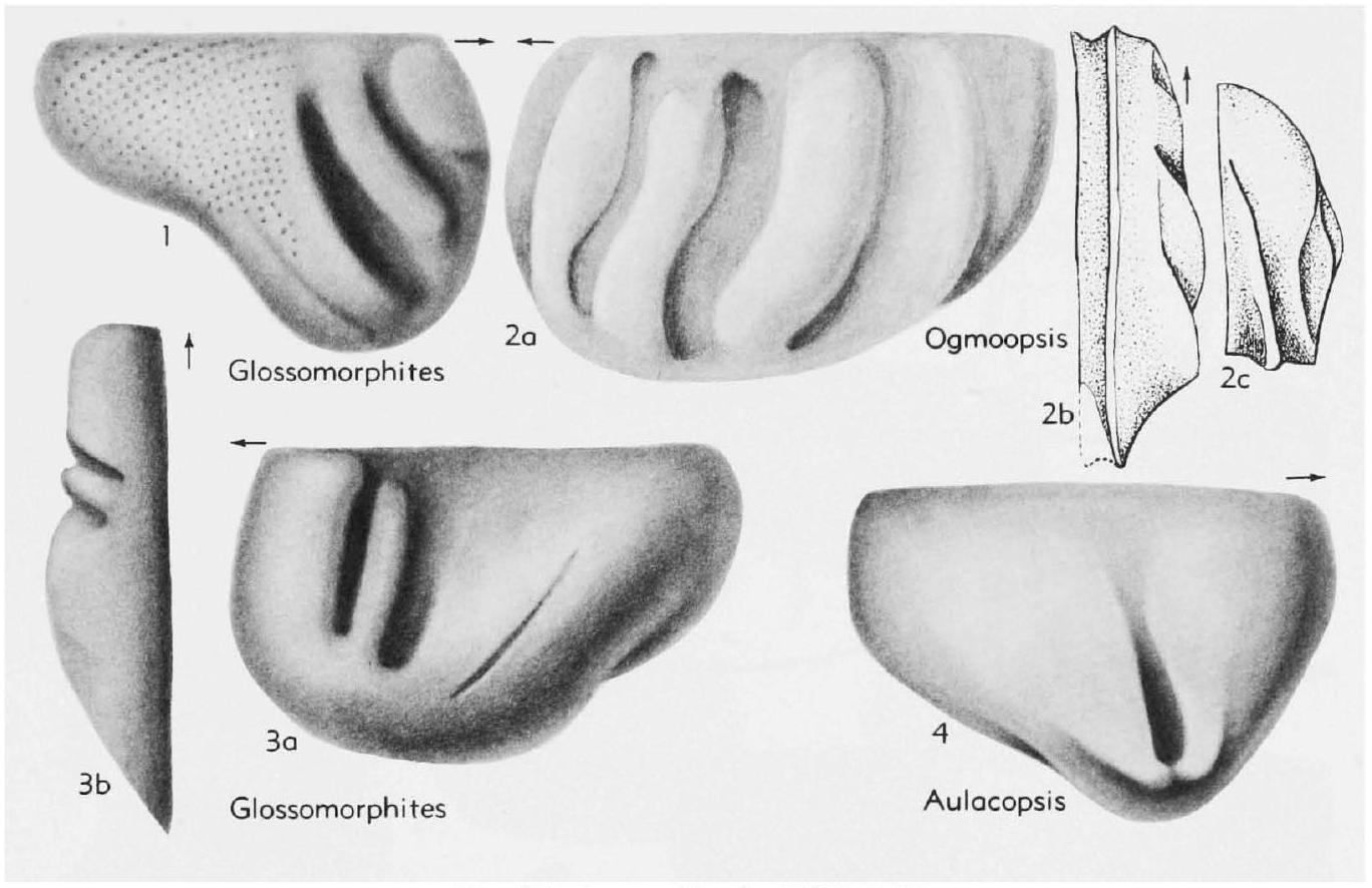 Fig. 87,3. *G. lingua (Hessland), Swed., 3a,b, LV lat., dors., X50 (Kesling). -- Fig. 87,1. G. alatus (Hessland), Swed., RV lat., X60 (Kesling, 1951).