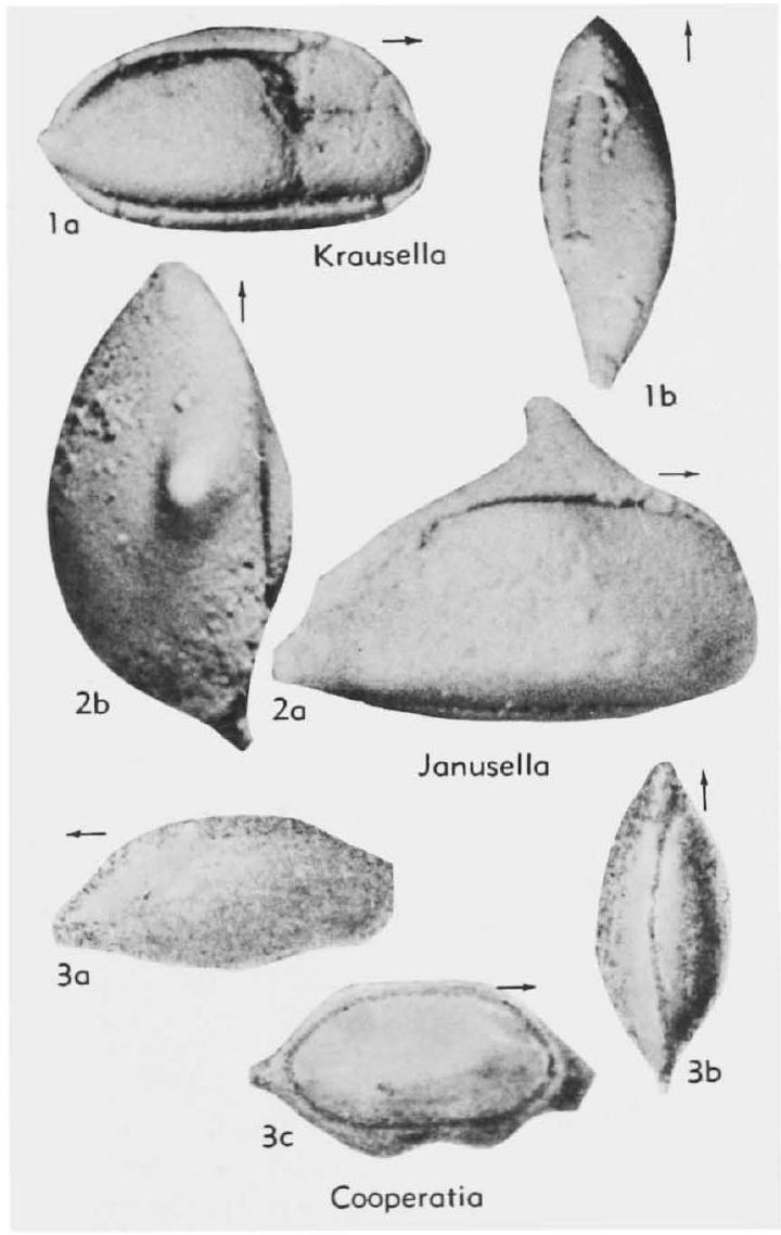 Figs. 293,1, 294,la,b. *K. inaeqltalis, M.Ord., USA (III.) ; 293,Ja, carapace (holotype) R, X15; 293,lb, carapace (topotype) vent., X15; 294,la, carapace dors., X20; 294,lb, crosssection showing overlap, X33 (Berdan, n). -- Fig. 294,2a-e. K. sp., M.Ord. (Edinburg F.), USA (Va.) ; 2a-e. carapace R, L, vent., X20 (I. C. Kraft. n).