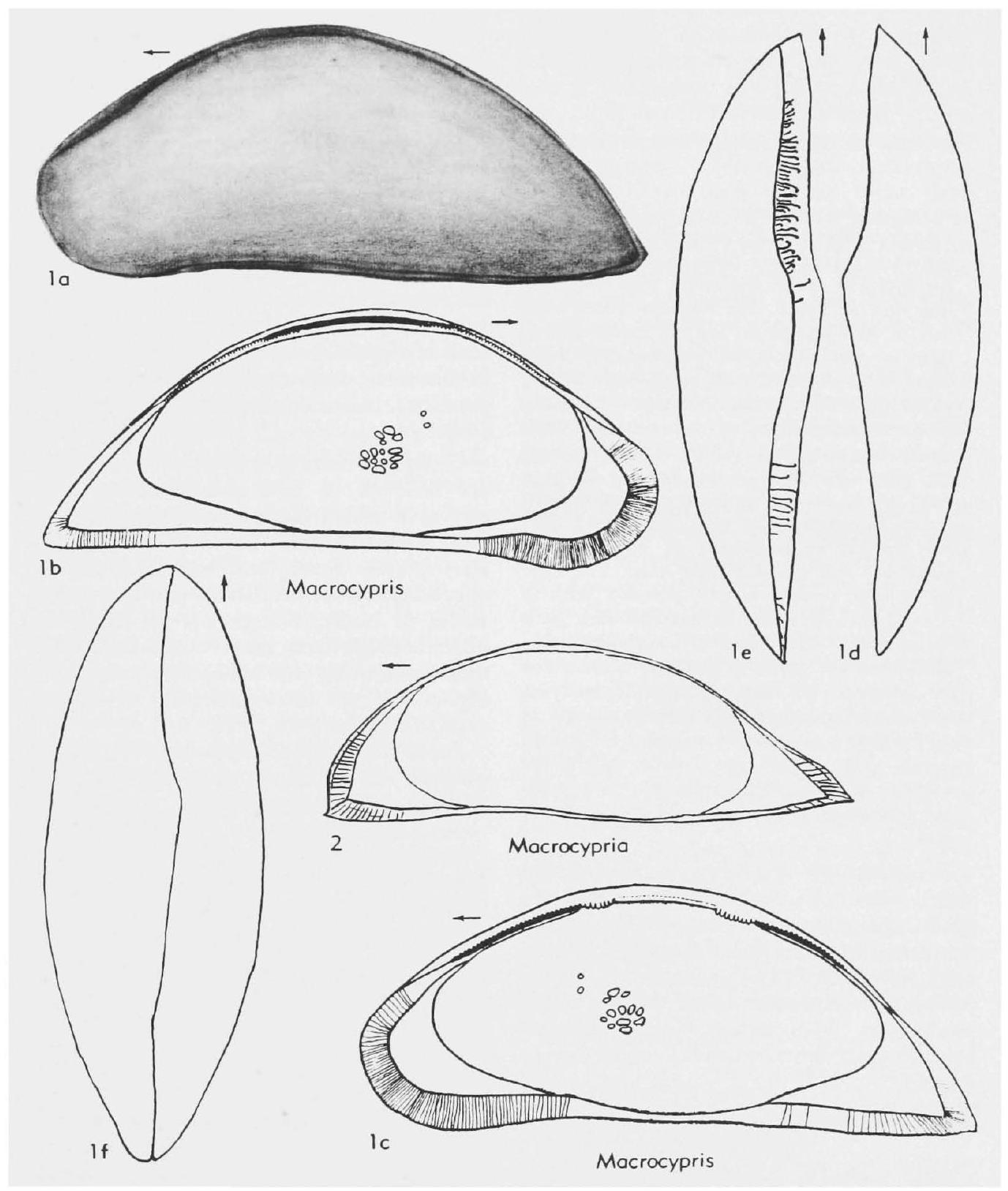 Fig. 146,1; 244,8ab, "*M. minna (BAIRD) Rec., Norway; 146,1a, carapace L, 1b,c, LV int., RV int., 1d,e, LV, RV vent., 1f, carapace vent., all ×30 (Syl-vester-Bradley, 1948); 244,8a,b, LV dors., RV dors., ×125 (Sylvester-Bradley, 1948)
