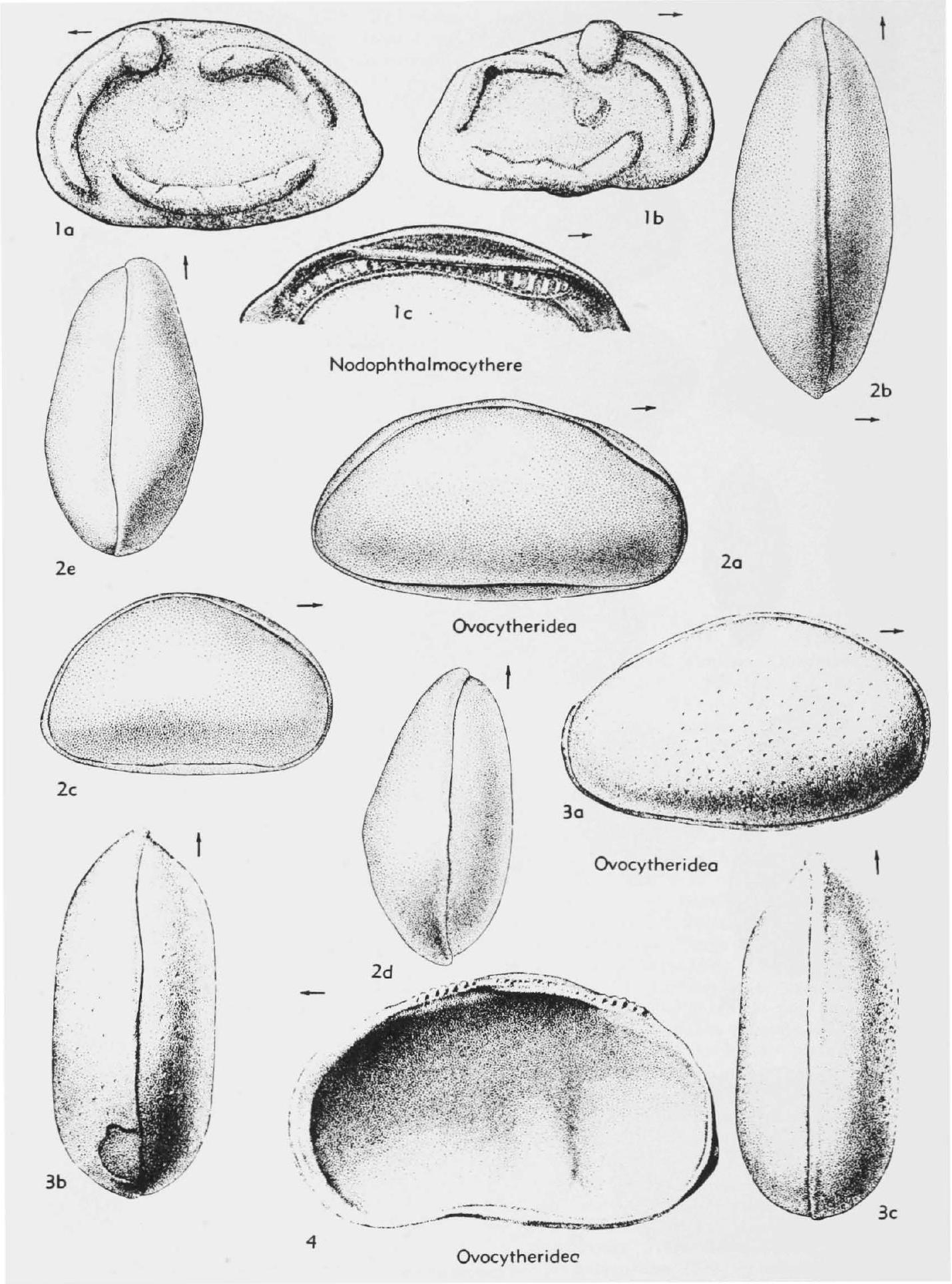 Fig. 209,2. *O. nllda, Campan., Cameroons; 2a,b. male carapace R, dors., X60; 2c·e. female carapace R, dors., vent., X60 (293). -- Fig. 209,3. O. symnufl·ica REYMENT, Coniac., N.Nigeria; 3a-c. carapace R, dors., vent., X40 (293). -- Fig. 209, 4. O. apitormis REYMENT, Coniac., N.Nigeria; RV int., X60 (293). [HOWE-REYMENT.]