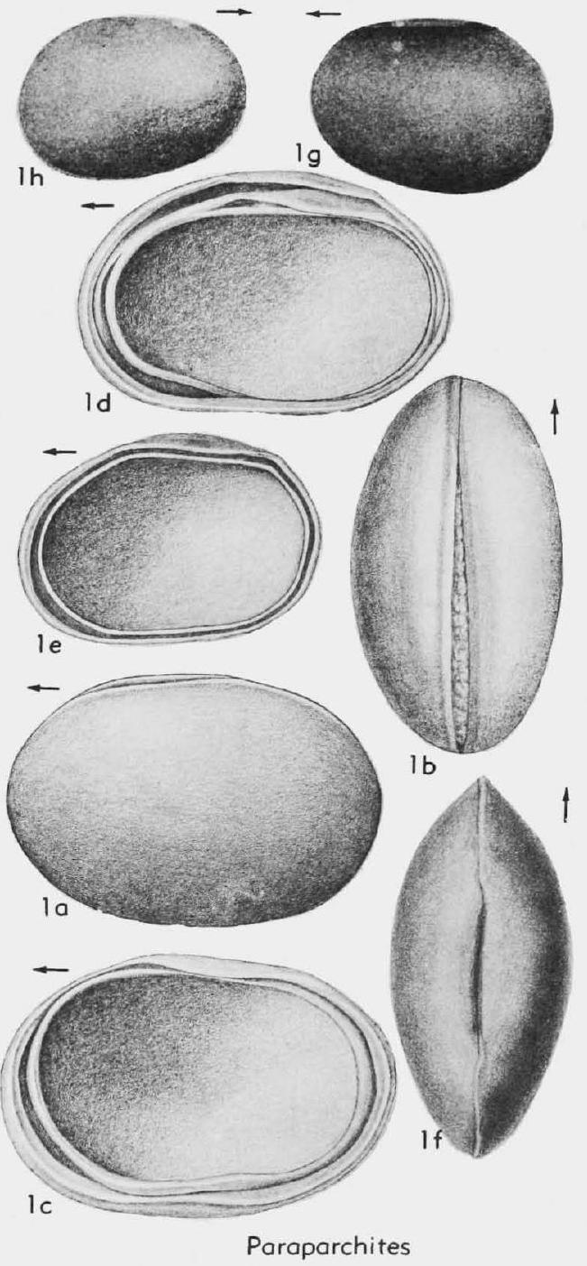 Fig. 135,1a-f. *P. humerosus, L.Perm. (Admire), USA(Kans.), 1a,b, carapace (lectotype) L (slightly tilted to show hinge channel), vent.; 1c-e, RV int., 3 specimens showing instar valves retained inside adult; 1f, carapace (paratype) dors.; all X21 (324). -- Fig. 135,1g,h. P. reversus (CORYELL & ROGATZ), L. Perm., USA (Tex.) (type species of Antiparaparchites); 1g,h, carapace L, R, X30 (128).