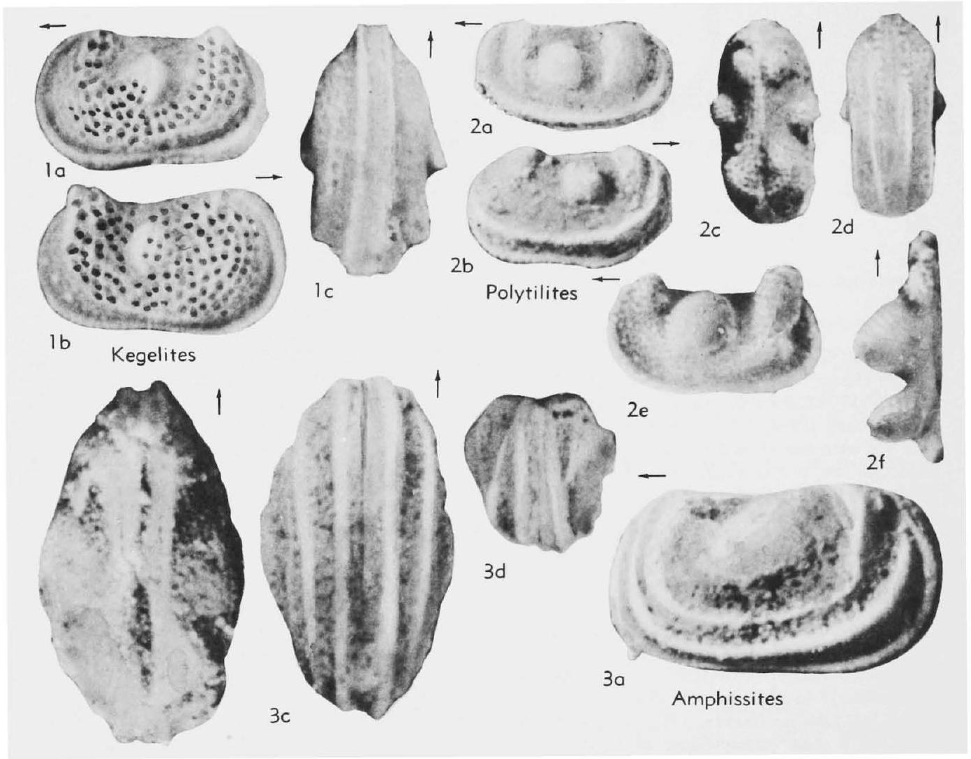 Fig. 98,2a-d. *P. geniculatus, Miss., USA(Ill.), 2a-d, carapace (holotype) L. lat., R lat., dors., vent., X40 (Sohn, n). -- Fig. 98, 2e,f. P. digitatus Sohn, M.Perm., USA(Tex.), 2e,f, LV (holotype), lat., dors., X40 (73)