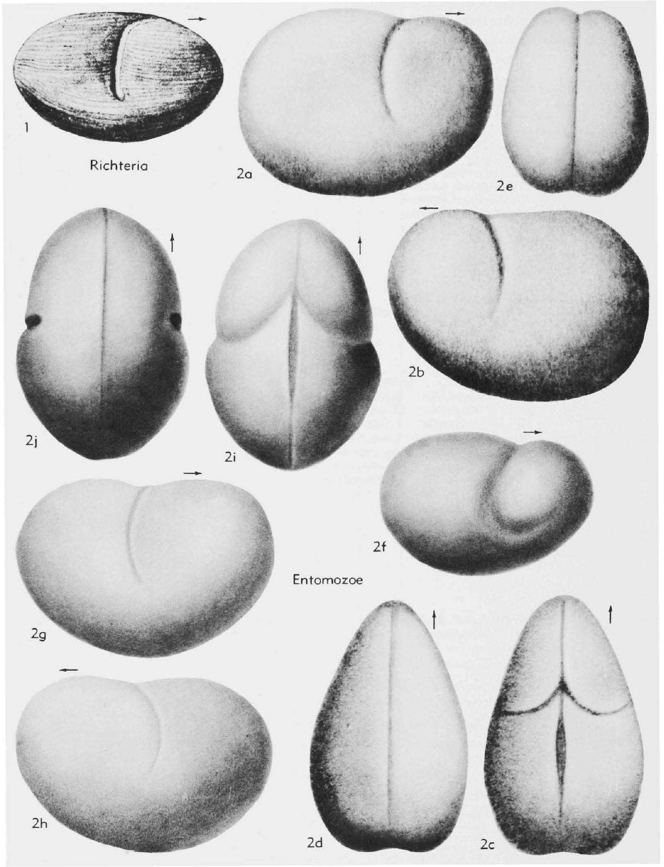 Fig. 312,1. *R. serratostriata (Sandberger), U.Dev., Ger., RV lat., X30 (244). -- Fig. 313,1. R. lamarmorai (CaNavari), Sil., Sardinia, la-e, carapace R, L, dors., vent., post., X15 (119)